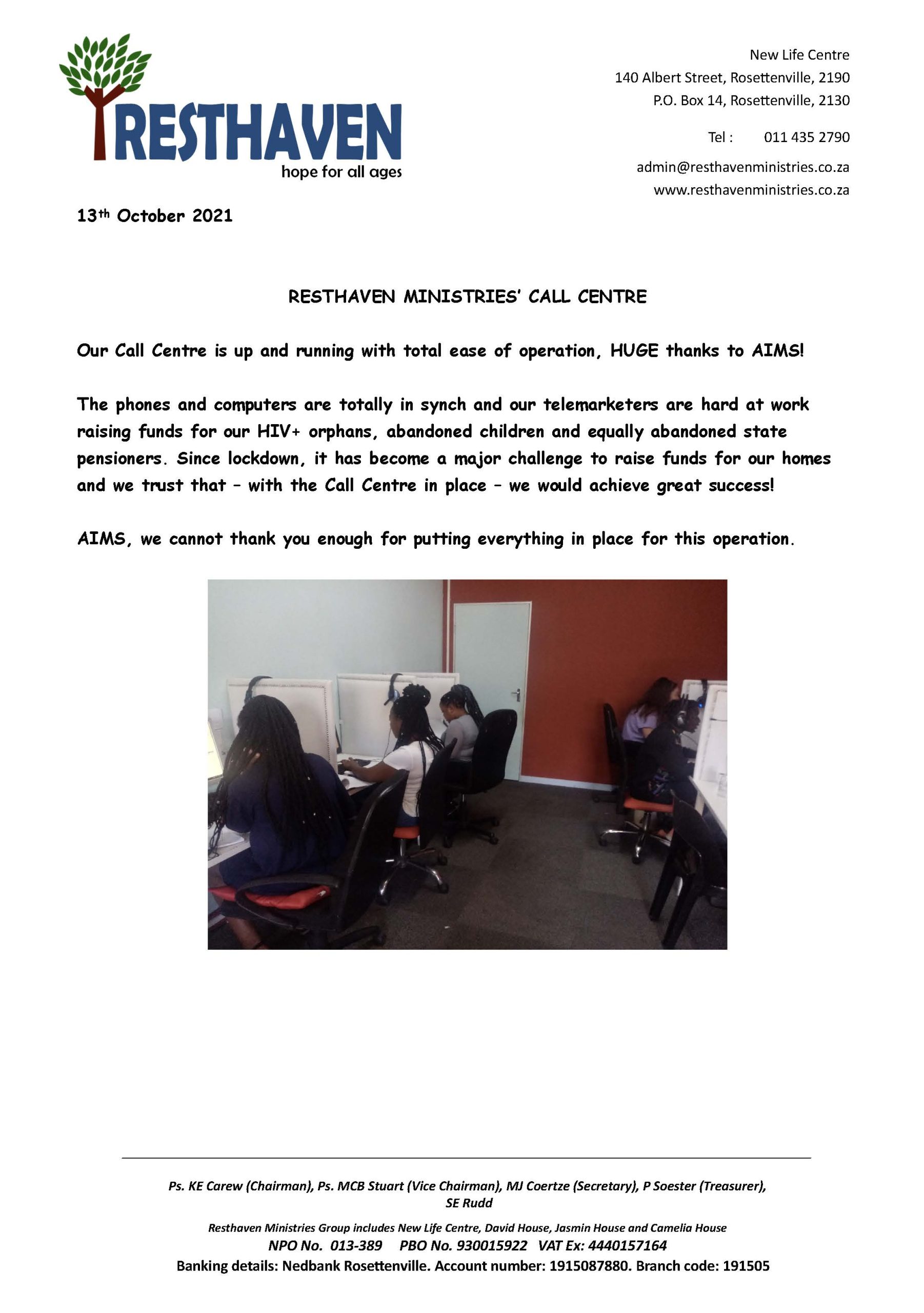 Once we have everything up and running, we will be updating our social media platforms with pictures of our call centre and will certainly make reference to your organisation as our donors.”